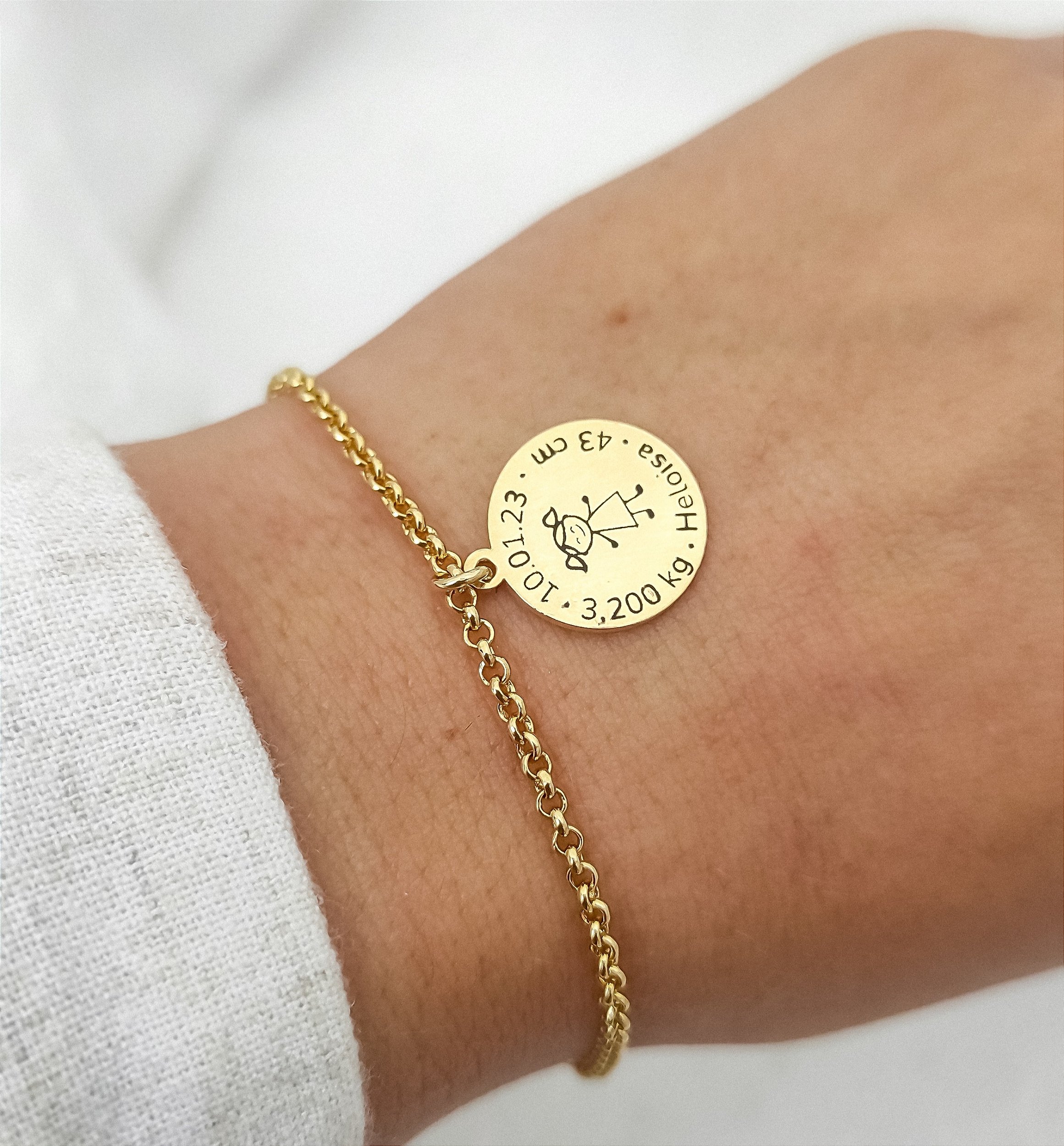 Pulseira Personalizada Medalhinha dados de nascimento, semijoia banhada em ouro 18k, antialérgica e com 1 ano de garantia.