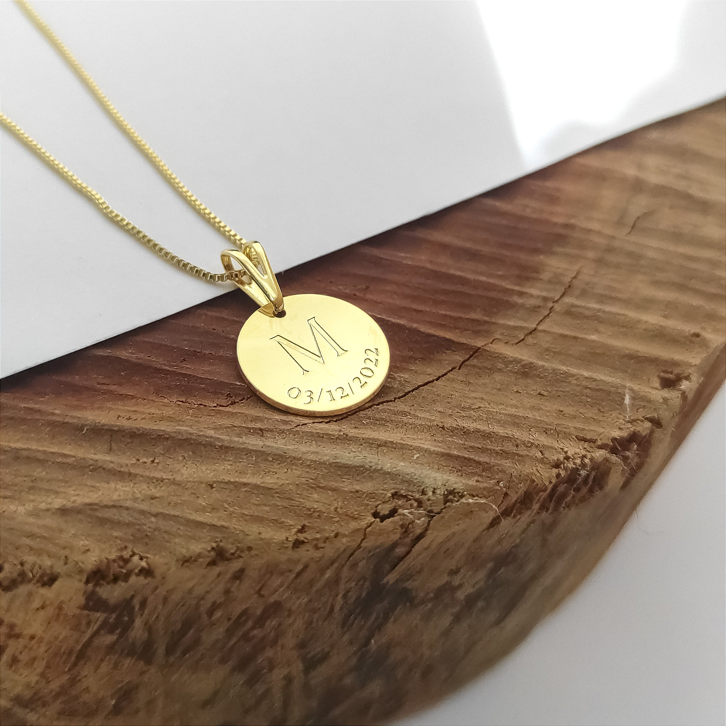 Colar Personalizado Medalha letra e data, semijoia banhada em ouro 18k, antialérgica e com 1 ano de garantia.